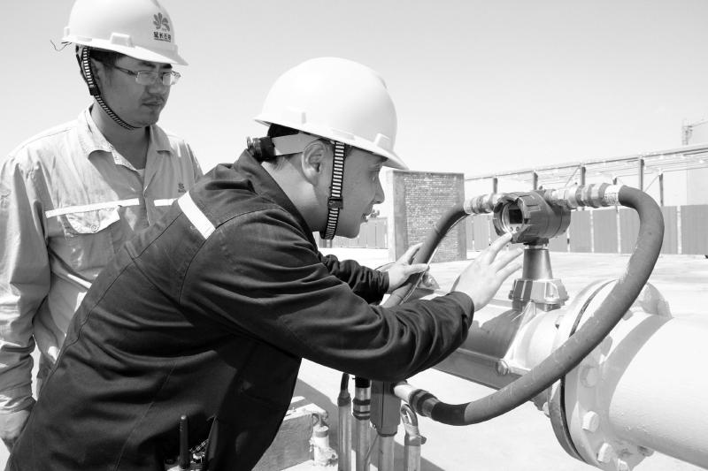 图为油煤公司天然气末站外操人员认真巡检,查看流量。