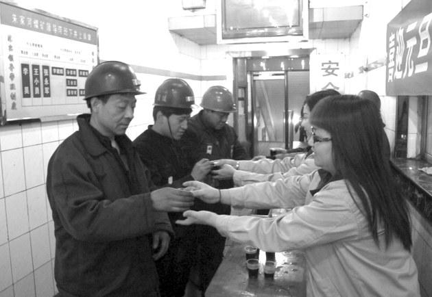 为了让坚守在一线工作岗位上的职工过一个温暖的元旦佳节,2015年1月1日早,朱家河煤矿女工委组织女工协管员在井口开展的“喜迎元旦共保安全”慰问活动,为一线职工送姜汁可乐,并准备了纽扣和针线为职工缝补衣服。女工协管员对矿工师傅送去新年祝福的同时,叮嘱他们一定要时时刻刻按照作业,注意安全。大家纷纷表示在生产过程中保证做到遵章守纪,让亲人放心,确保安全生产。图为女工协管员为一线职工送姜汤。