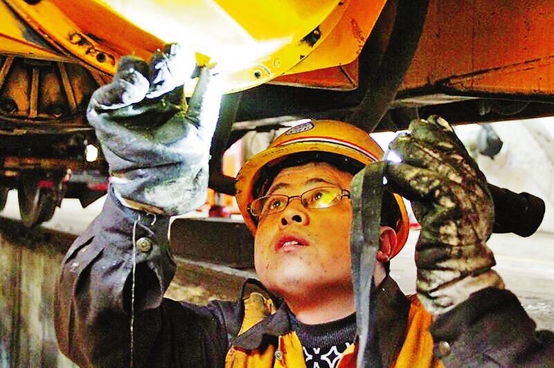 近日,西安工务机械段利用休整间隙,加强对机械重点操控部位、关键作业环节进行检查保养,着力排除设备故障隐患,挖掘设备作业潜能,为高质高效完成即将展开的线路集中修任务提供坚实保障。图为该段职工正在调整卫星小车走行部件。郭永良摄