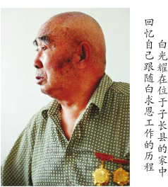 白求恩走了,但他却影响了白光耀的一生。此后,白光耀被选派到晋察冀边区为了纪念白求恩而成立的白求恩卫生学校学习,两年后分配至晋察冀边区独立团卫生队担任队长。1944年,白光耀回到延安,并在新中国成立后长期从事医疗工作,把白求恩的事业继承下去。(陈晨)