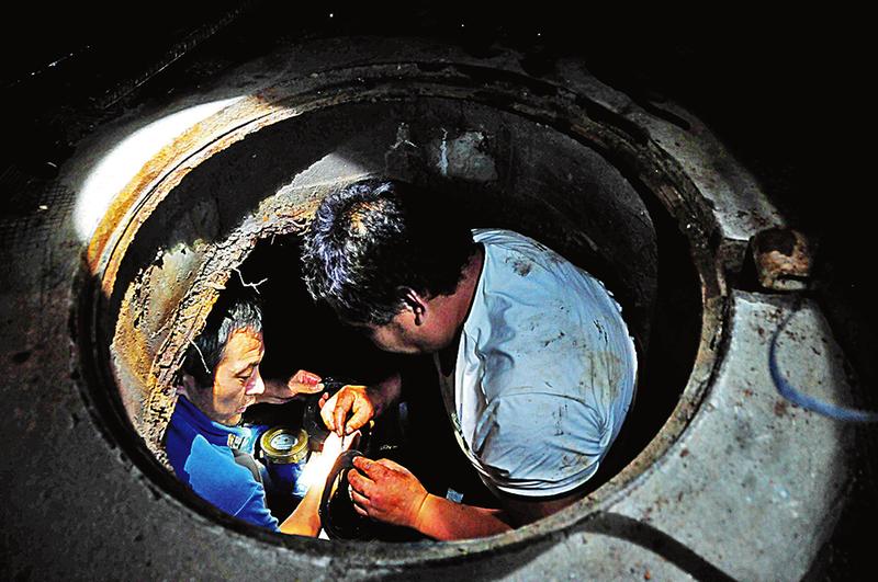 9月19日中午,西安普天通信有限公司家属区普天小区高层住宅楼供水系统突然发生故障,时值周末并在用水高峰期,得知消息,西安普天物业公司立即组织人力进行抢修。由于井内地方狭小,多级串联阀件出现故障,维修难度很大,工人蹲在水中摸索着工作。入夜后大家只能打着手电照在井中工作,一直干到晚上十点多钟才排除了故障恢复了供水。王忠义摄