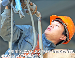 本报讯9月15日,在榆林炼油厂15万吨/年重整技术改造项目建设现场机器轰鸣、人声鼎沸,一派热火朝天的劳动场景。施工人员正在对焊接过后的管线进行检查,确保焊接质量,严格把好质量关。