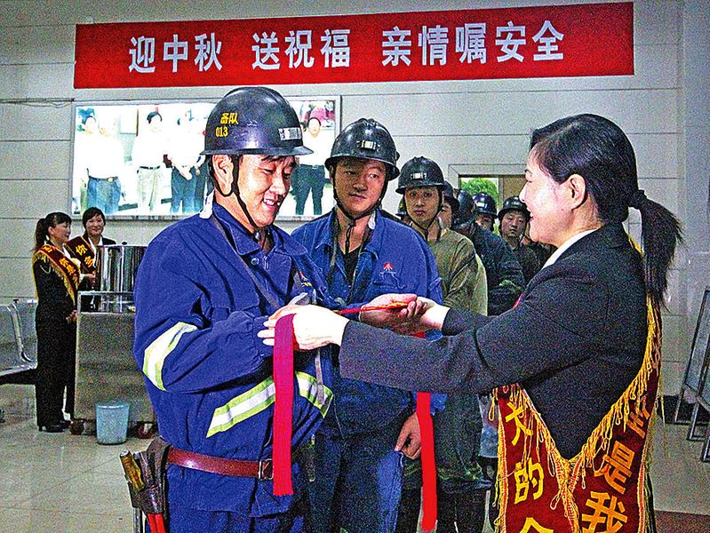 9月27日中秋节早上,黄陵矿业二号煤矿候车室洋溢着浓厚的节日气氛,该矿家属协管员在这里开展“迎中秋、送祝福、亲情嘱安全”活动。家属协管员们把象征团圆的月饼和象征平安的苹果送到了矿工兄弟的手中,并叮嘱他们在节日期间要时刻牢记安全第一,按章操作。