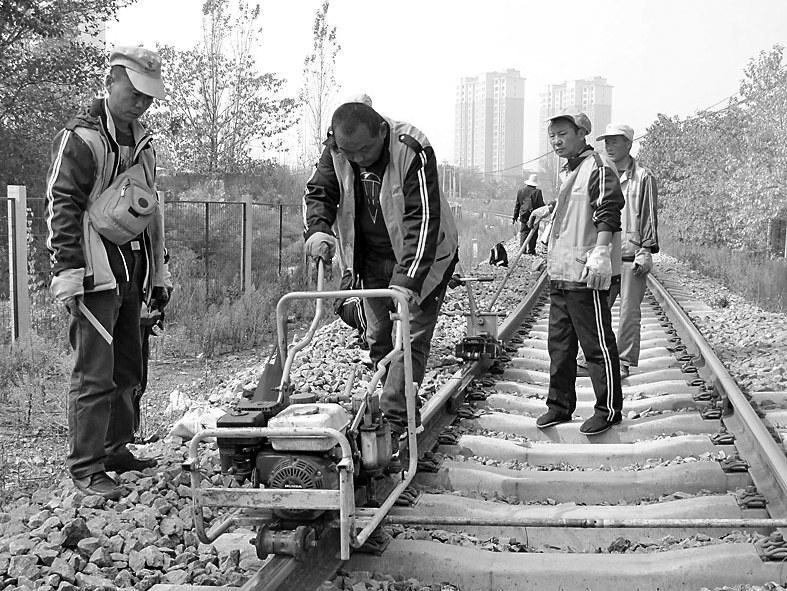 漏地徒步全面排查,,同时利用探伤仪、、捣固机等科技设备为线路全面体检,,保证入冬前的线路养护工作顺利完成。。图为该公司工务段线路工正在养护线路。