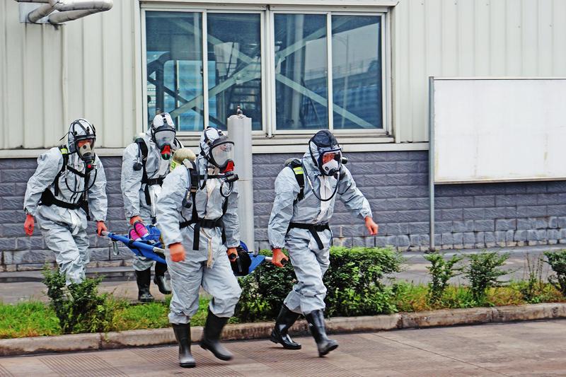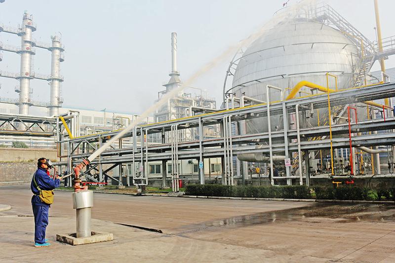 “百日安全”活动期间,陕焦化工公司组织的系列大型应急演练活动在各大厂区现场相继展开。图为12月1日,该公司在甲醇厂合成氨现场举行的液氨罐区球罐泄漏综合应急演练。