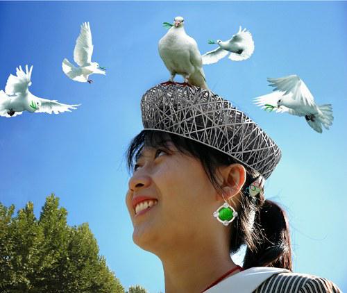 08奥运前夕,看到北京鸟巢体育馆设计造型,设计理念是:形态如同孕育生命的“巢”,它更像一个家的摇篮,寄托着人类对美好未来的希望。鸟巢给了我新的灵感,完成了《时尚·鸟巢》新作。模特头戴鸟巢贝雷帽,吸引鸽子在头顶飞翔,耳坠、发卡均有五环标志符号,时尚。