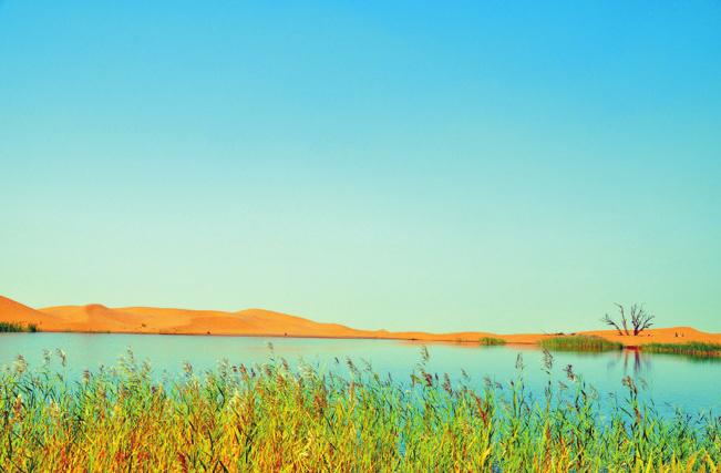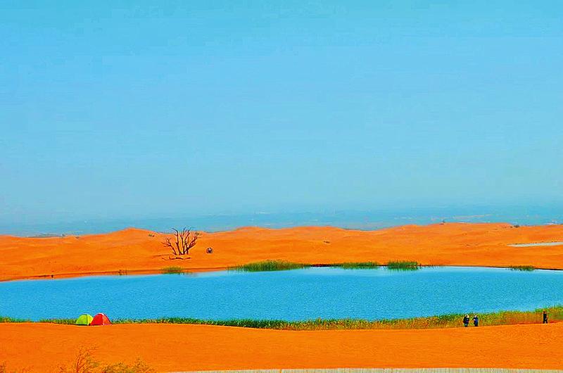 继续前行,远远望见浩浩荡荡的驼队,逶迤行进在绵延起伏的沙丘中,不远处可以看到一座仿古楼阁,爬上一座小沙丘的最高处俯瞰,楼阁附近竟有一片绿宝石似的湖水。湖区呈长带状,面积虽然不是很大,却很秀气。微风吹过,荡起层层涟漪,水边是密密匝匝的芦苇丛,有一人多高,米白色的芦花飞舞着。远处的野鸭等野生鸟类或群行、或独处,却被我们这些闯入者惊起,“呱呱”叫着飞走了。秋日里的湖色分外迷人,微波泛动,碧水粼粼,湖中游鱼如梭,忽聚忽散。