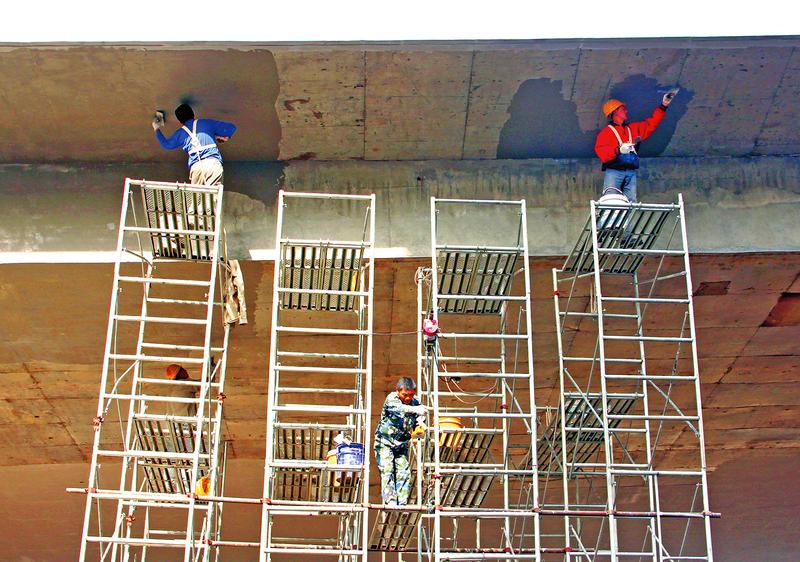 4月10日,在西安市北二环朱宏路十字正在建设的三层半互通式立交工地,建筑工人们正在紧张有序工作中。据了解,朱宏路上四座立交桥计划2016年底建成通车,建成后将提升北二环和朱宏路的通行能力,缩短城区与机场的通达时间。本报记者刘强摄