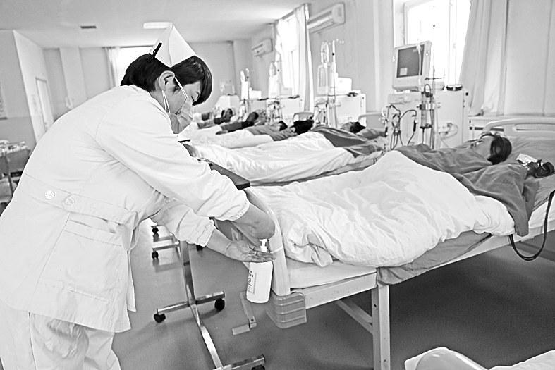 图为血液透析室护士余华在操作仪器前做手消毒。李琳摄