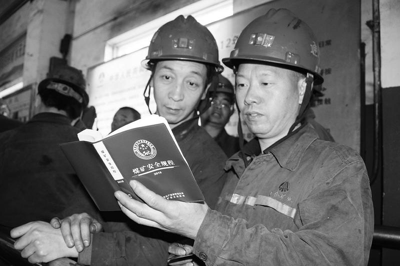 5月17日,澄合矿业董东公司入井长廊,即将入井的早班职工拿出新版《煤矿安全规程》进行岗前再学习再警示。