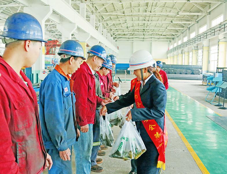 ←6月8日,在端午节到来之际,黄陵矿业机电公司组织家属协管员为一线职工送去了粽子和香包,叮嘱他们在工作中注意安全,在节日里坚守好岗位。