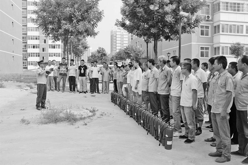 为了提高职工防火意识和灭火能力,8月4日蒲白白水社区举行消防演练活动,该社区70余名职工参加了演练。图为消防战士在讲解消防器材的使用方法。孙梦摄