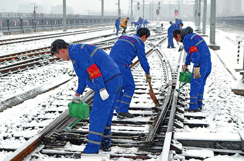 图为西安地铁线路工使用扫把、扁铲、融雪剂等工具材料,对各场段线路、道岔的积雪进行清理,最大程度减少降雪冰冻带来的不利影响,保障线路安全畅通。