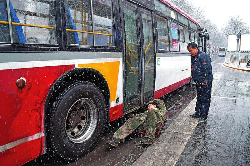 2月21日,西安迎来降雪天气,为保障公交车运行安全,西安公交客车总厂立即启动“低温天气抢修预案”,在抢修调度安排中,以线路故障车抢修为主,共出动抢修队伍40人,已抢修车辆28台。图为抢修人员钻进车底紧急抢修。本报记者 钟洁 摄