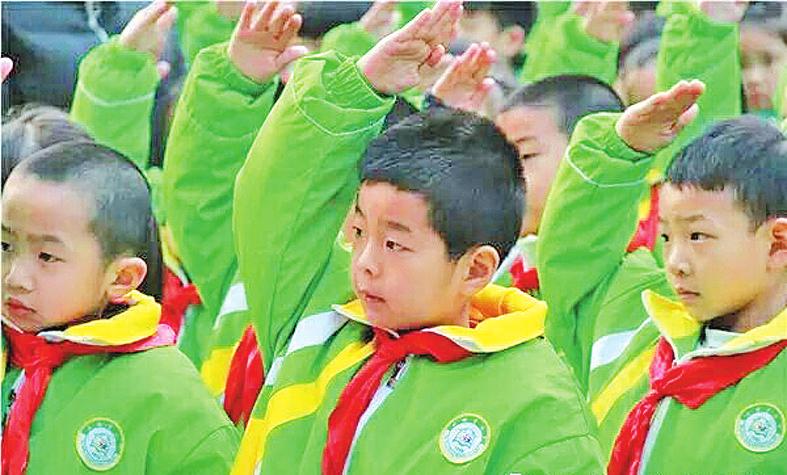 2月13日,西安市未央区大明宫小学举行春季开学典礼活动。图为孩子们向飘扬的国旗敬礼。本报记者 毛静 摄