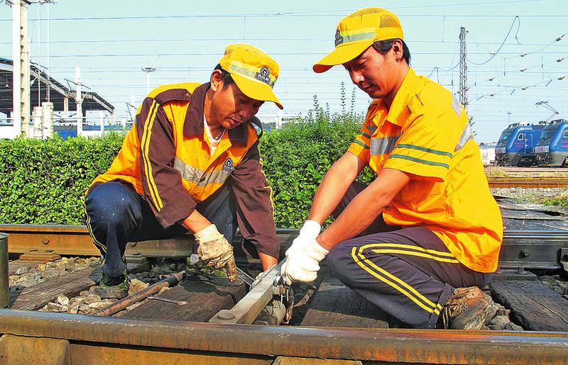 连日来,新丰镇机务段扎实开展秋季设备大检查活动,确保设备状态良好。图为该段整备车间职工在整修机车库内道岔设备。朱传伟摄