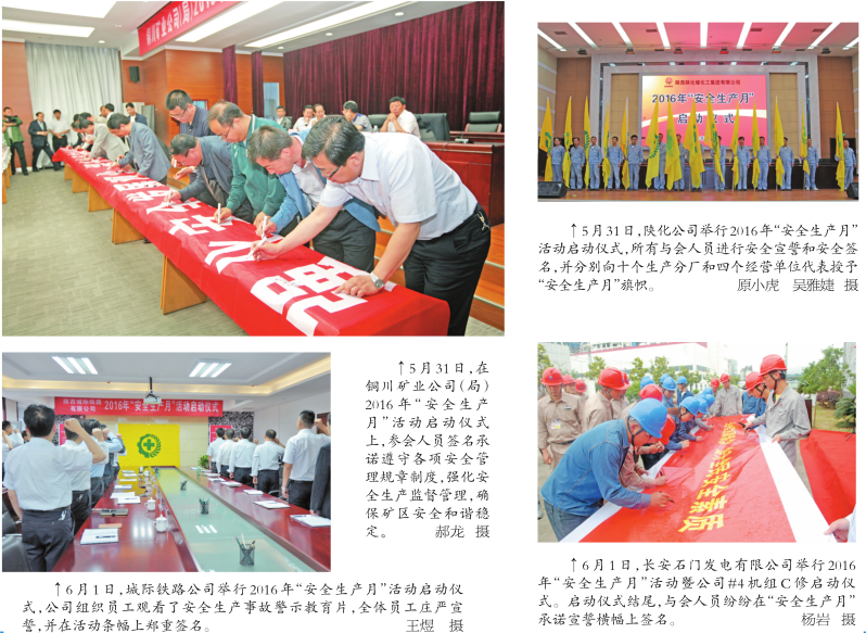 ↑5月31日,在铜川矿业公司(局)2016年“安全生产月”活动启动仪式上,参会人员签名承诺遵守各项安全管理规章制度,强化安全生产监督管理,确保矿区安全