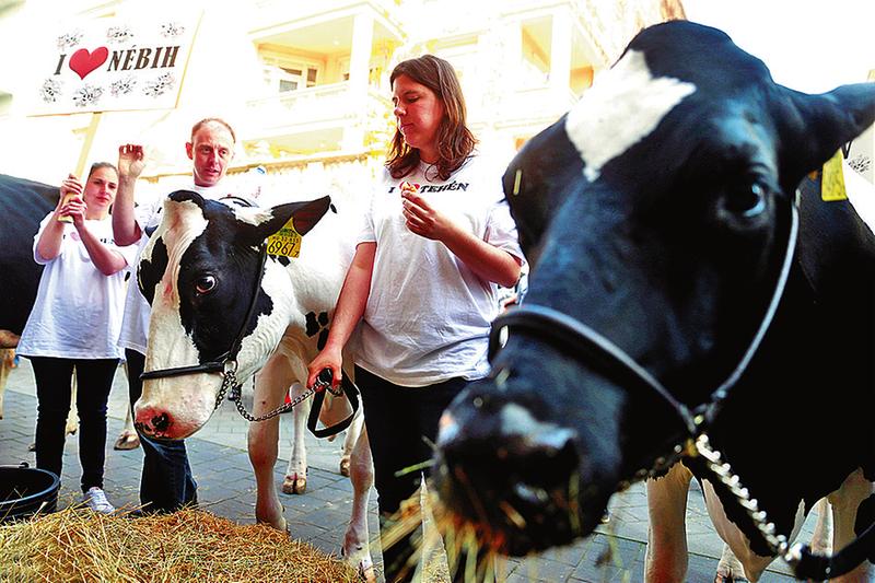 当地时间4月4日,匈牙利布达佩斯,匈牙利奶农组织游行,抗议奶产品价格下降。 宗合 摄