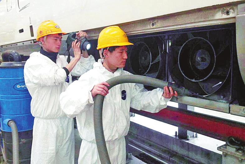 近日,西安动车段集中组织对配属的40列56组动车组开展整修工作,以消除动车组各部设施安全隐患和质量缺点,确保为旅客们提供安全、舒适的动车组列车。图为