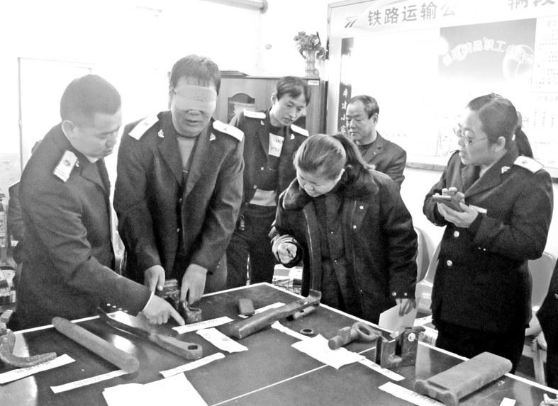 “车钩防脱莲、开口销、丝堵………”12名被蒙住眼的列检员通过手摸准确地报出车辆各部件名称及作用。近日,蒲白铁运公司举办了“蒙眼摸车辆配件”职工技术