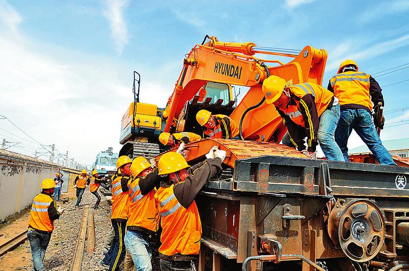 5月13日,绥德工务段开展防洪抢险应急演练,以赛促学,以学促练。图为该段党员突击队正在进行挖掘机装载加固应急演练的情景。韩二飞摄