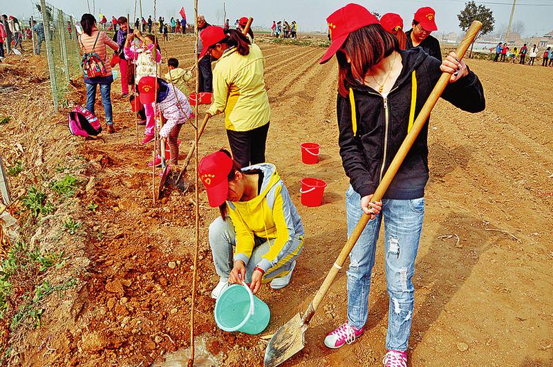 陕建一建集团七公司党政工团联合组织员工,将学雷锋和植树活动形成常态化。图为3月15日,该公司志愿者在兴平市马嵬驿开展学雷锋、义务植树志愿活动。