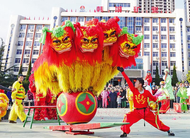 春节期间,韩城矿业公司以锣鼓、秧歌、舞狮闹春,通过举办群众文化活动展演,把新春的祝福送给矿区的千家万户,把矿区的年味尽情渲染。陈凤鸣 摄
