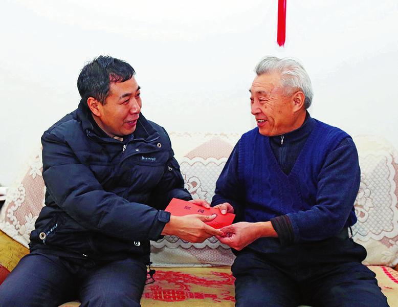 中铁十二局集团第四工程公司工会为让160多户困难职工、遗属、伤病残职工及老干部等过好春节,筹措慰问资金17万余元,行程上千公里到山西介休基地、西安片区走访慰问。图为近日公司工会主席侯仰红把1000元慰问金送到老干部李天佑手中。