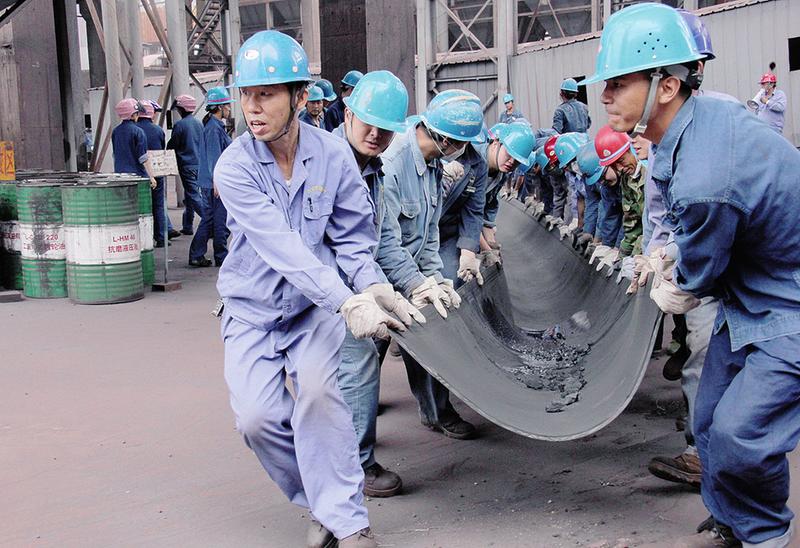 陕钢集团汉钢公司炼铁事业部高炉作业区原料工段却是一派热火朝天的景象,“一二、一二”的号子声划破长空,40多名作业工人,在“红袖章”的统一指挥下,三人一组,五人一列,整齐有序,在号子的健步齐走带动下,迎着似火的骄阳,负重向前,手臂上的汗水顺着鼓起的青筋流向指尖,皮带和汗水混合在一起……工段负责人宋占福解释道,此次更换皮带,时间紧迫,维修战线长,人机操作复杂,为保证不影响生产,他们提前3天制定好详细方案,准备好备品备件。更换皮带的当天,早上6点,所有人员就赶到到作业现场,更换206米长的焦7皮带。此皮带位置狭窄,机械单位无法全程操作,只能靠机械与人力配合的方式,从起配重、割带、打卡子、连接新旧皮带到将新皮带换下旧皮带,每一项工作都必须衔接和配合到位。