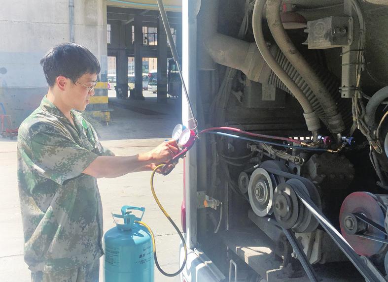 在公交车内黄伟杰检查起空调操纵器,“能启动,操纵器屏幕也亮着,说明操纵器有电,出风口有风但不凉,应该是缺少冷媒。”不到三分钟,黄伟杰就找到了“病因”。随后,他将车熄火,掀开了车辆后的发动机箱盖,一股热浪扑面而来。“这么高的温度不怕烫伤吗?”“没办法,司机在这等,要等车凉透得花好几个小时,我尽量小心点。”说着就开始动手进行修理。只见他小心翼翼地将真空压力表与压缩机相连接,再将冷媒罐与真空压力表相连接,接着拧开冷媒罐,边加边观察压力表上的数值是否正常。