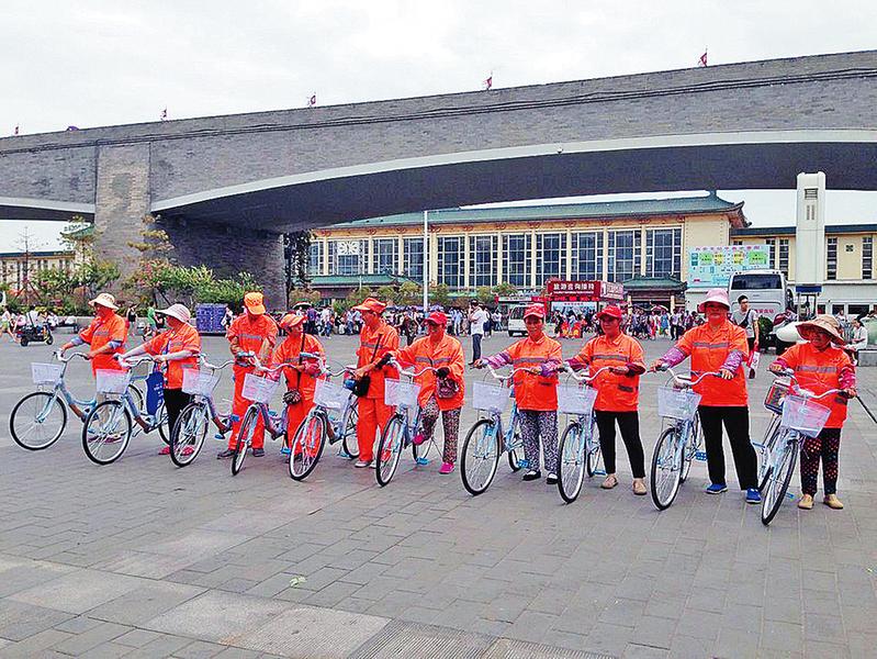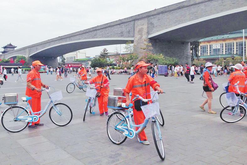 本报讯(梁鑫)暑运到来,西安火车站广场地区人流量不断加大,垃圾数量不断增多,为减轻保洁员的工作负担,提高工作效率,西安火车站广场管委会为保洁员们配备了定制的“专属”自行车,让“城市美容师”们的工作更加省时、省力。