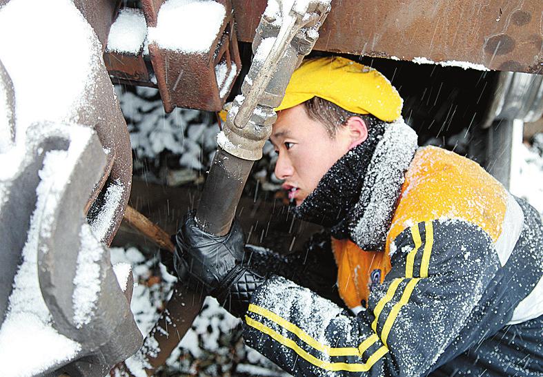 ↑昨日,西安东车辆段及时启动应急预案,抽调骨干力量成立突击队,到各包保站点开展扫雪作业。图为该段列检职工正在对列车连挂装置进行检查。胡小文摄