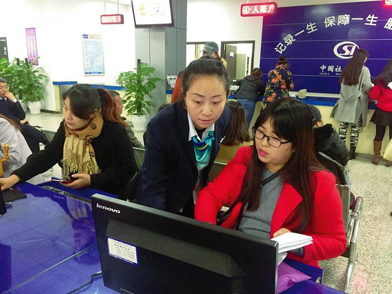 年底将至,每天到西安市莲湖区养老保险经办中心办理职工养老保险的参保企业和职工激增,为提高服务效率,该中心除了在大厅增设自主服务平台之外,还增派工作人员在大厅指导操作。图为工作人员在指导年检登记。董晓谦 摄