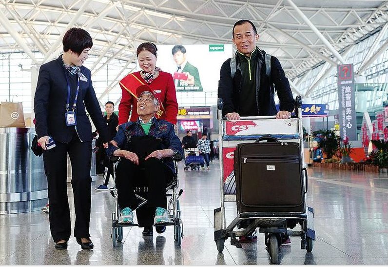 工作人员郭燕妮、石萌帮助老人办理登机手续
