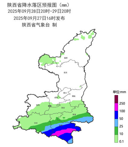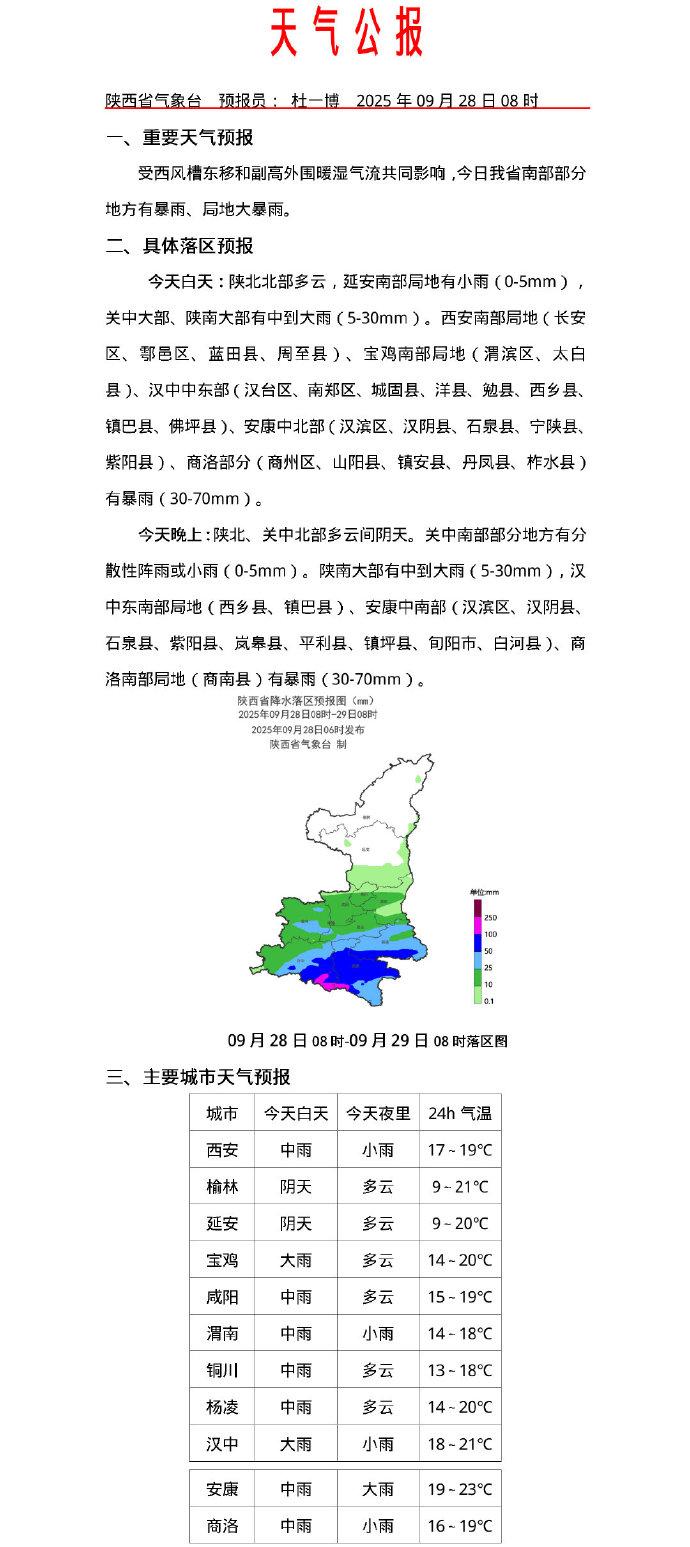 陕北多云间阴天,延安南部局地有小雨(0-5mm),关中、陕南阴天有中雨(5-15mm),西安大部、宝鸡南部、咸阳南部、渭南南部局地、汉中、安康大部、商洛、杨凌示范区有大雨(25-50mm),西安南部局地(长安区、鄠邑区、蓝田县、周至县)、宝鸡南部局地(太白县)、汉中中东部(汉台区、南郑区、城固县、洋县、勉县、西乡县、镇巴县、佛坪县)、安康中北部(汉滨区、汉阴县、石泉县、宁陕县、紫阳县)、商洛部分(商州区、山阳县、镇安县、丹凤县、柞水县)有暴雨(30-50mm)。