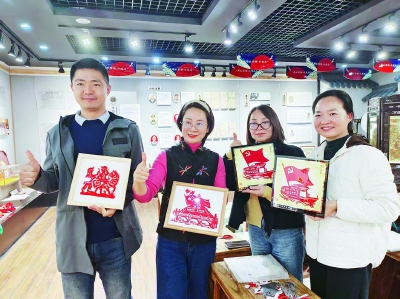 近日,西安市碑林区直机关工委组织60多名干部职工,在区文化馆非物质文化遗产传承教育实践基地举办“红韵领航·非遗生辉”主题文化活动。图为干部职工展示剪纸手工作品。