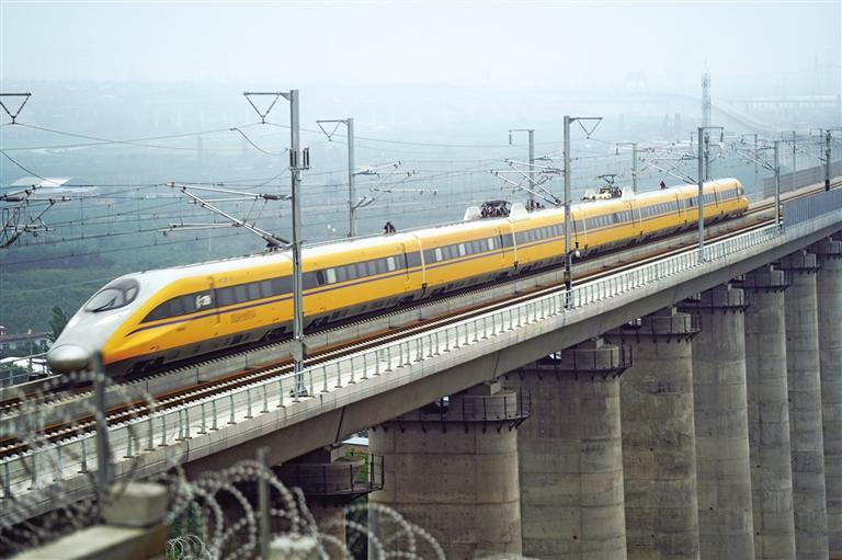 10月9日,DJ(动检)502次综合检测列车通过西延高铁富平特大桥。 受访单位供图 10月9日,DJ(动检)502次综合检测列车完成西延高铁全线拉通试验。这标志着由中国铁路西安局集团有限公司(以下简称“西安铁路局
