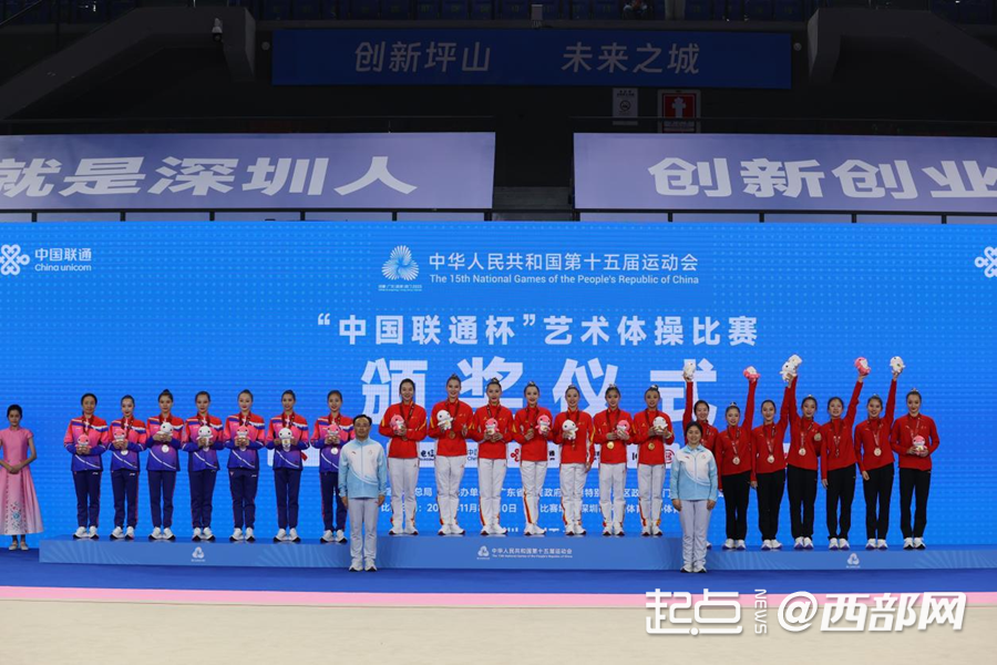 11月10日下午,第十五届全国运动会艺术体操项目集体全能决赛在深圳市坪山体育中心体育馆举行。陕西艺术体操队凭借稳定发挥与充满中国风的精彩演绎,以总分96.70分斩获铜牌,在全国顶尖选手的巅峰对决中,展现出陕西艺