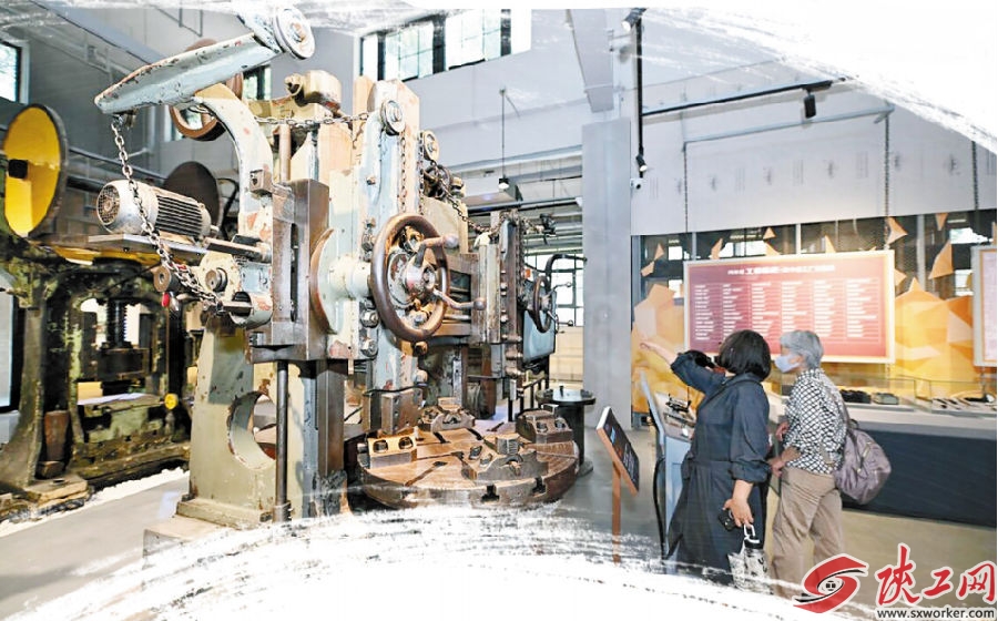 游客在天津机床工业博物馆内参观机床设备。